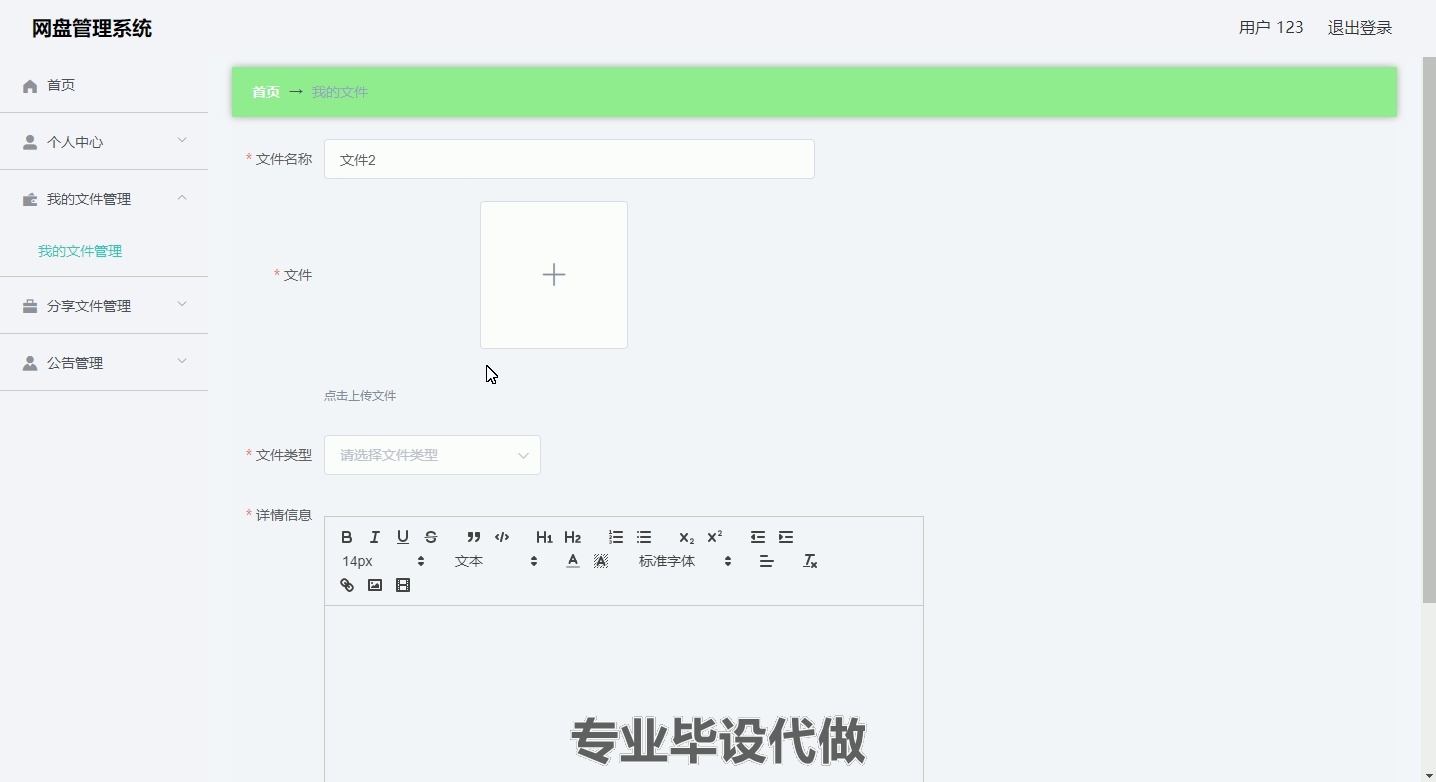 The network disk management system is to establish a data table in MySQL to save information, and use Vue framework and Java language to write. And in accordance with the software design and development process for design and implementation. The system is friendly and fully functional. After the administrator logs in and enters his backend, he manages users, manages file types, manages announcements, and downloads and inquires about files shared by users. Users upload files, share files, view announcements, and file information successfully shared.