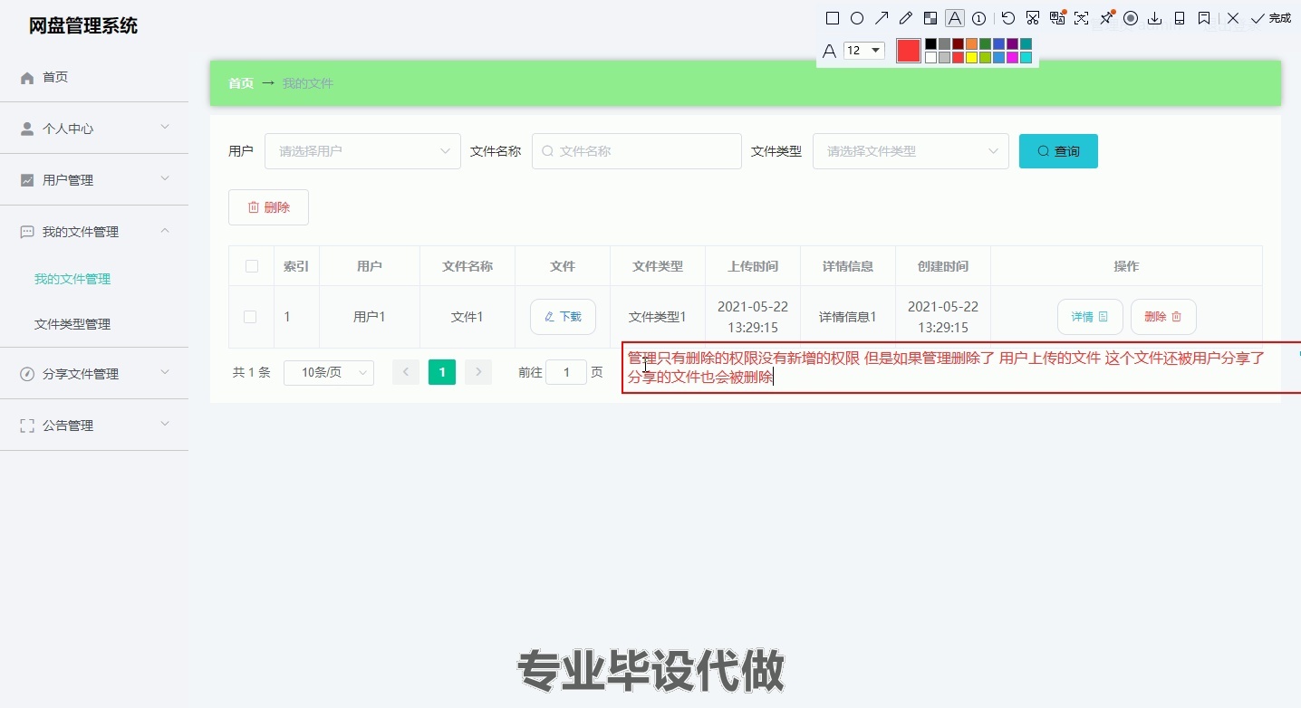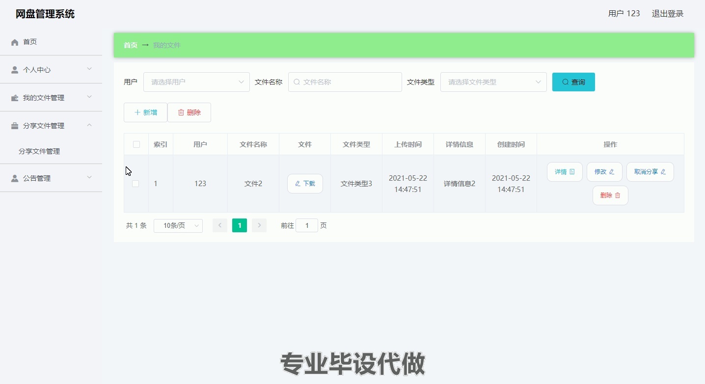 网盘管理系统是在MySQL中建立数据表保存信息,运用Vue框架和Java语言编写。并按照软件设计开发流程进行设计实现。系统具备友好性且功能完善。其管理员登录进入本人后台之后,管理用户,管理文件类型,管理公告,下载和查询用户分享的文件。用户上传文件,分享文件,查看公告以及成功分享的文件信息。