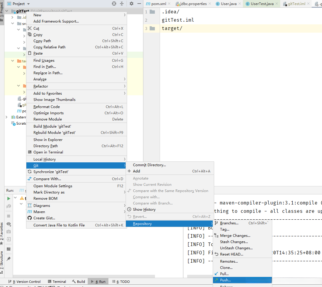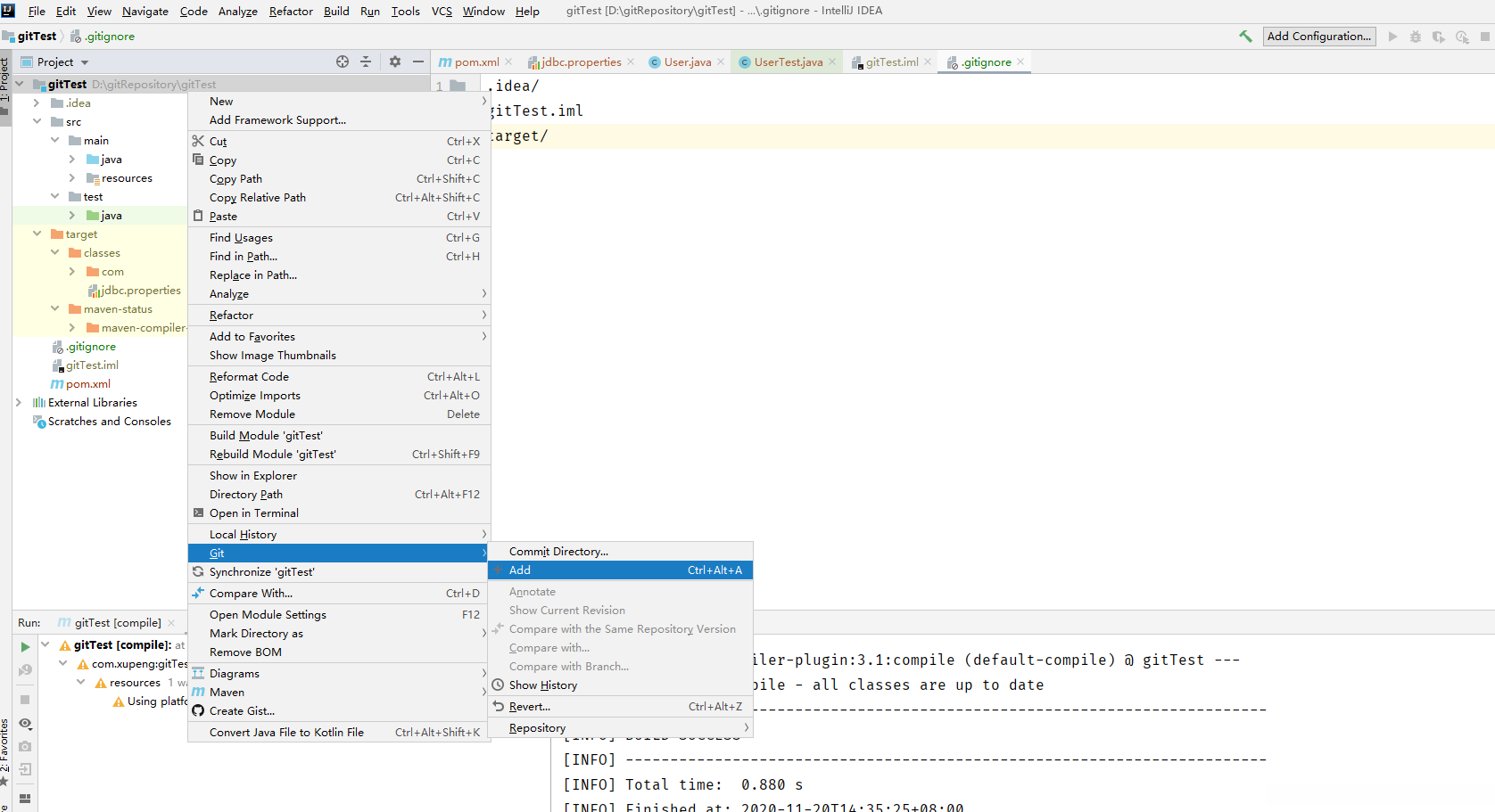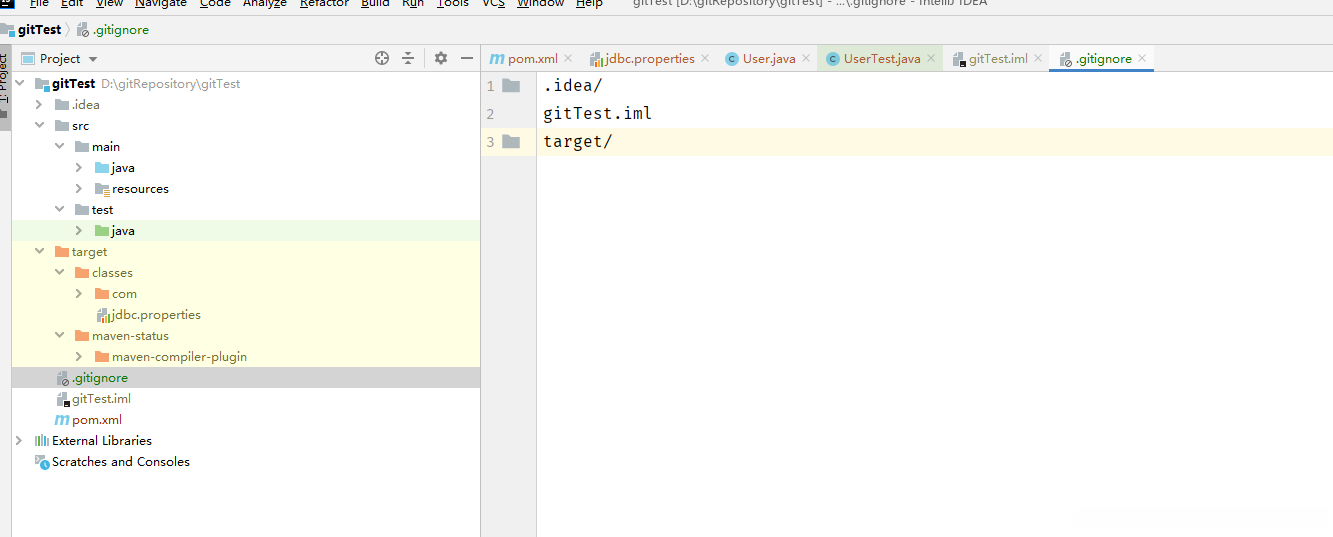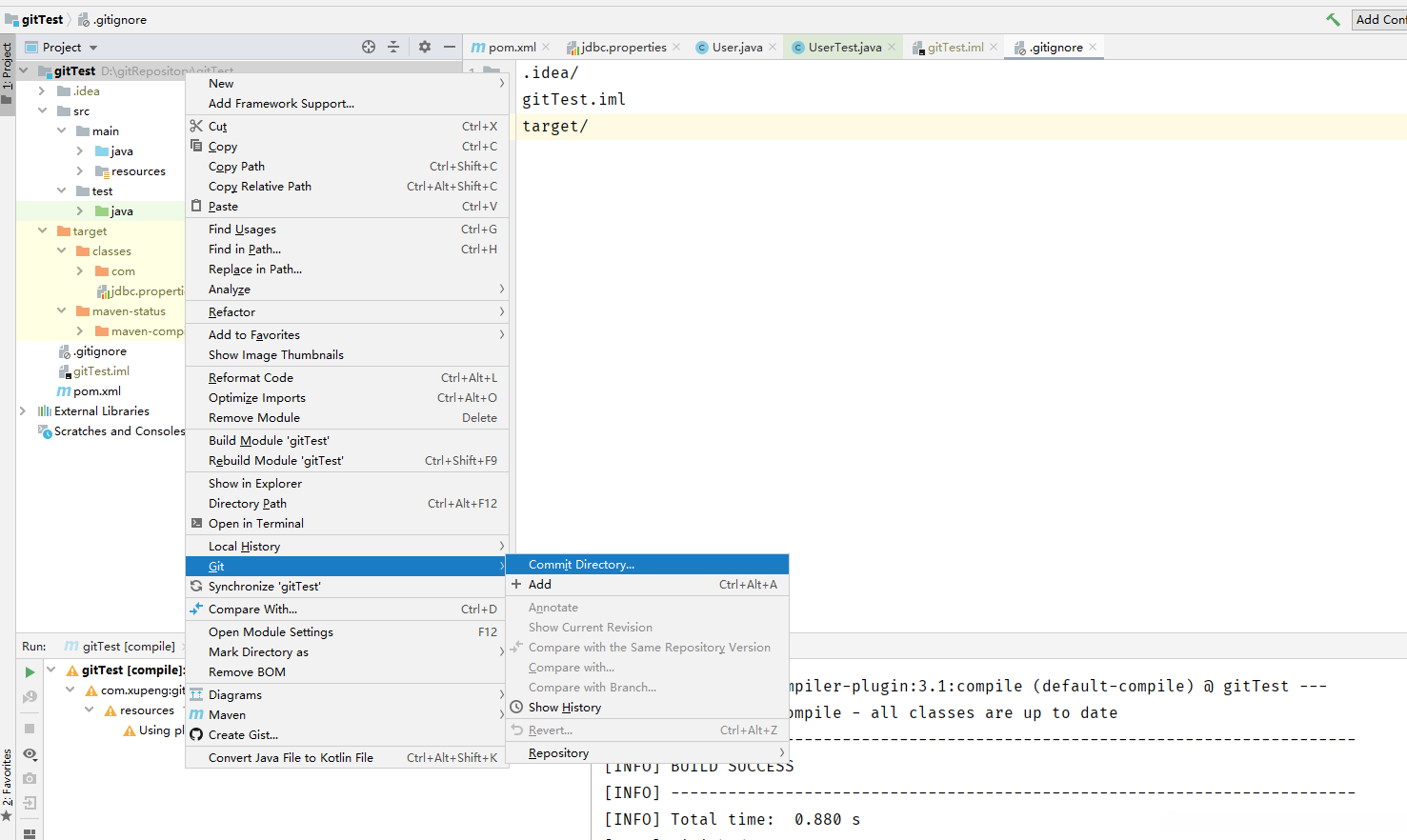 请注意,在大多数情况下,并非所有文件都需要将项目归档到暂存区;实际上而言,并非所有文件都需要将.idea和gitTest.iml配置为不提交。