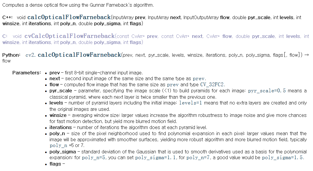 calcOpticalFlowFarneback(prevgray,gray,flow,0.5,3,15,3,5,1.2,0);