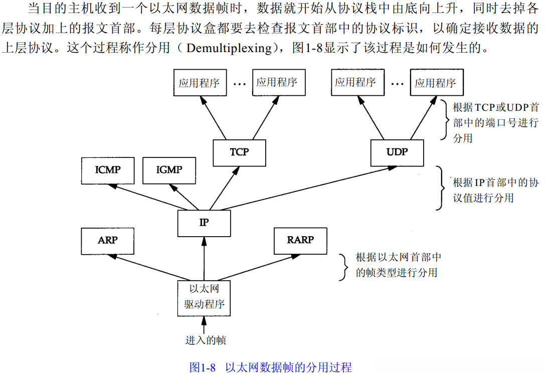 每当一个数据帧抵达主机时,它会依次经过数据链路层、网络层和传输层,在每一层次解析报文首部中的协议标识以识别接收到的数据.这一过程被称为分用;因此,在TCP/UDP协议下,上一层应用程序能够分配相同的端口号给不同的连接.