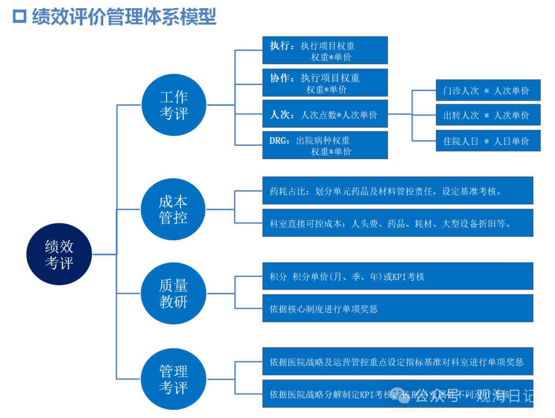 在谈到绩效考核的具体分配方案时,在推进DRG/DIP预付制改革的背景下,若医院绩效考核机制未及时优化,则可能导致'过度计费、增加收入但医保支付力度不足'的局面。这种情况下不仅不利于医院自身的经济效益提升,并且会导致其在追求利润空间时不得不采取'多花钱少受益'的方式运作。这不仅不利于医院自身的经济效益提升,并且还会进一步加剧其内部资源分配的不均衡性。在此背景下现行的绩效核算模式面临着较大的挑战,在这种压力下各种新型的绩效考核或分配模式也相应应运而生: