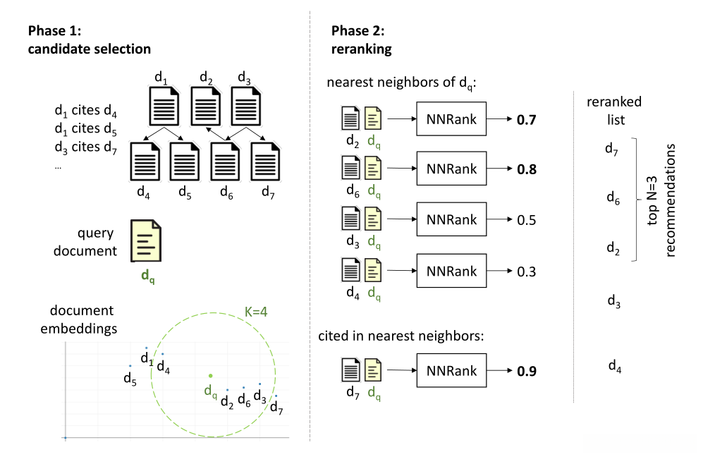 如下图所示为引文推荐系统概述。在阶段1 (NNSelect)中,将语料库中的所有文档(在这个简单的例子中是7个)以及查询文档dq投射到向量空间中,并使用它的(K=4)最近邻:d2、d6、d3和d4作为候选文档。我们还添加了d7作为候选,因为它在d3中被引用。在阶段2 (NNRank)中,我们对每一对(dq, d2),(dq, d6),(dq, d3),(dq, d4)和(dq, d7)分别打分,以重新排序候选文档,并返回前3名候选文档:d7,d6和d2。