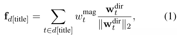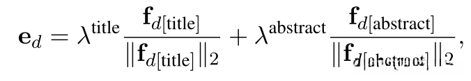 然后我们对每个字段的表示进行规范化,并计算字段的加权平均值,从而得到文档的嵌入ed。在我们的实验中,我们使用文档d的title和abstract字段: