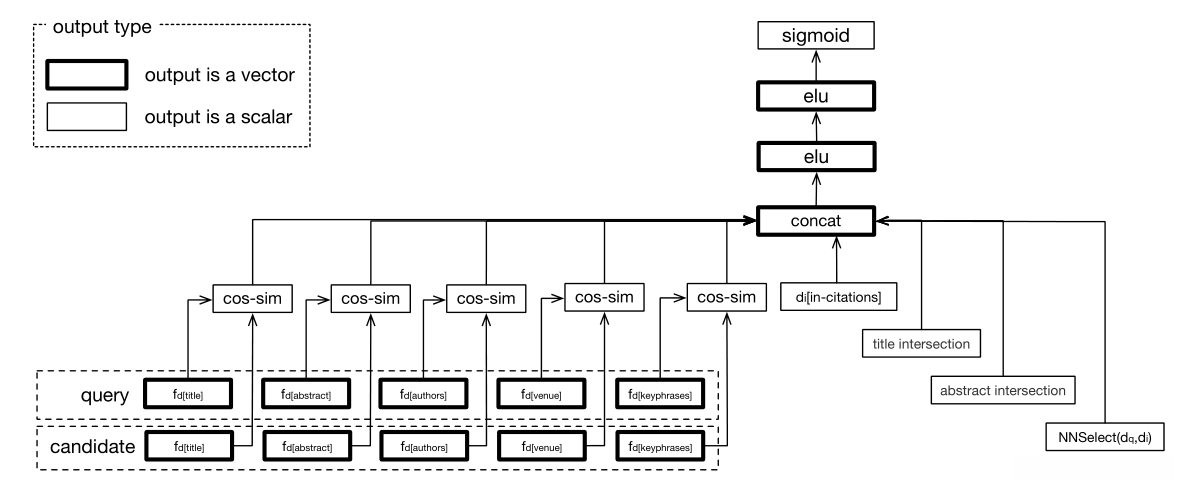 NNRank架构。对于每一个文本域和类别域,我们计算dq的嵌入与di对应的嵌入之间的余弦相似度。然后,我们将余弦相似度分数、数值特征和交集词的加权和串联起来,然后是两个具有ELU非线性的稠密层。输出层是一个具有s型非线性的稠密层,用来估计dq引用di的概率。