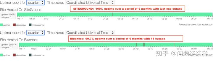 上图为您提供了快照,表明SiteGround在运行时间方面比Bluehost更好。