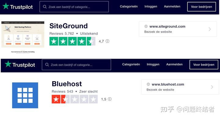 如下所示,SiteGround的评级为4.7 / 5,而Bluehost的评级为1.5 / 5令人失望。