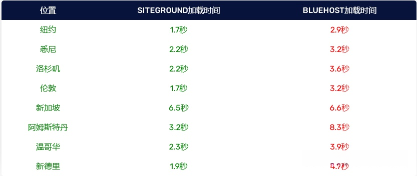 - SiteGround的加载速度较全球其它主要竞争对手Bluehost快一倍半(150%),其中美国市场表现尤为突出。