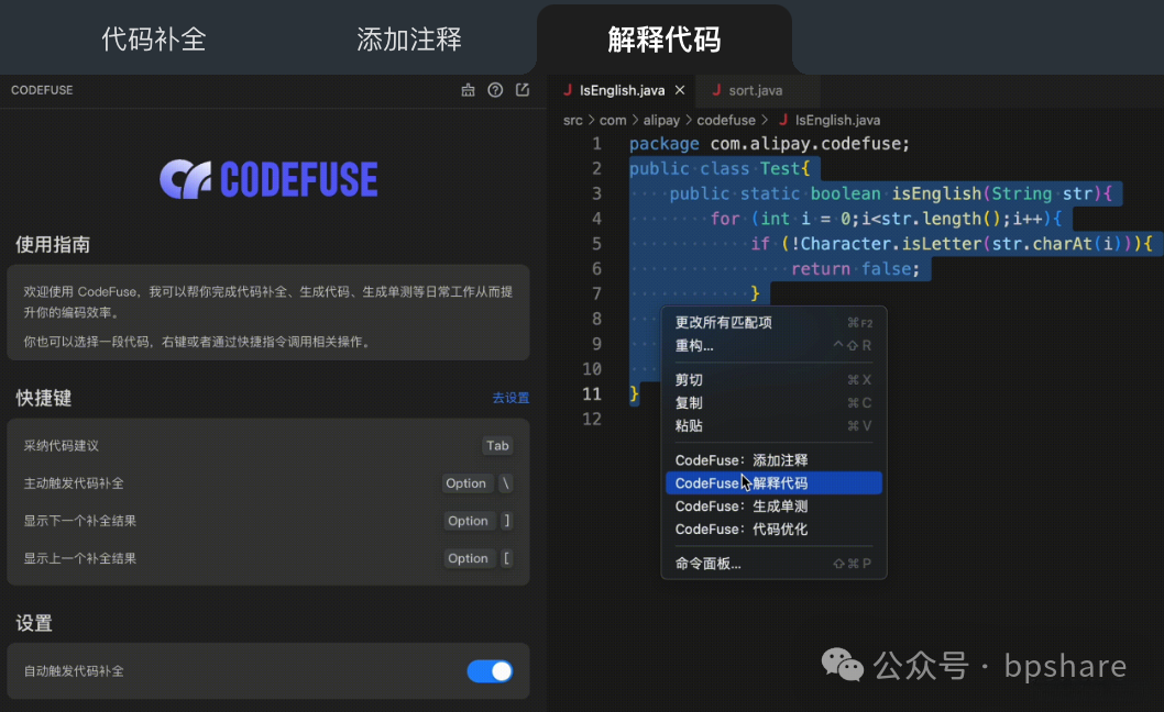 CodeFuse是一款专为国内开发者打造的一站式智能化研发解决方案产品。该产品通过基于蚂蚁集团自主研发的基础大模型进行优化与扩展而形成,在领域内处于领先地位。它集成了以下核心功能:包括代码补全功能、添加注释功能、对代码进行详细解释功能、生成单测用例功能以及代码优化功能,并旨在帮助开发者提升开发效率并降低学习成本。