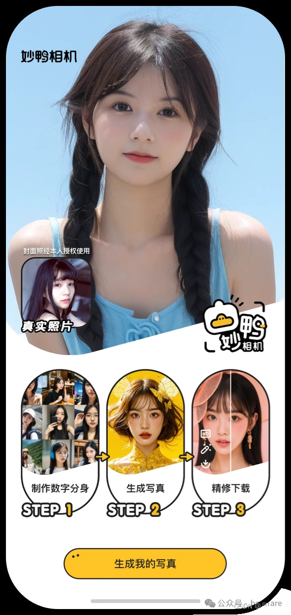 妙鸭相机利用AI技术训练消费者上传的照片数据来生成初始人脸模型,并将这些模型应用到其他类型的模型上生成照片(具体来说就是AI系统能够识别并提取人的五官特征,并将这些特征替换成新的发型、妆容、服装和场景元素来创造出一张全新的图片)。这样一来就能轻松创造出多种多样化的作品