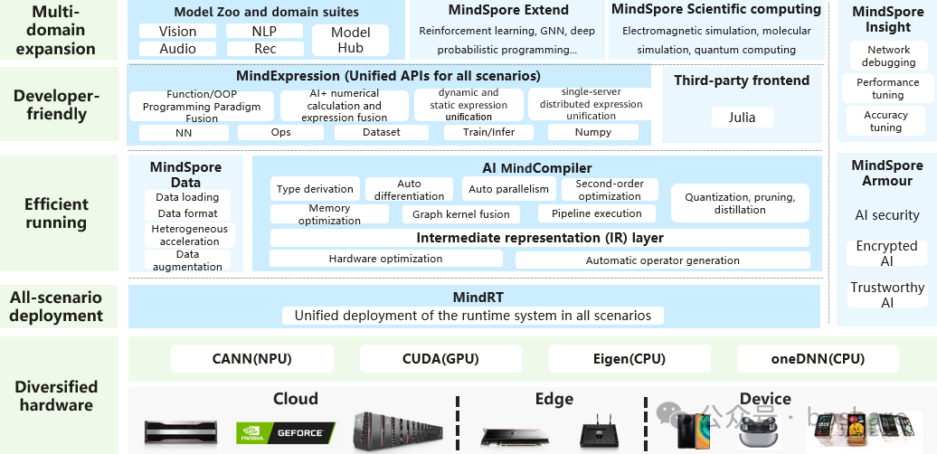 MindSpore是一款专为端边云环境设计的新一代开源深度学习训练与推理框架;它凭借友好且高效的架构设计,在提升数据科学家与算法工程师的工作体验方面表现突出;此外该框架不仅内置支持Ascend AI处理器的功能性组件;还通过软硬件协同优化实现了性能的最大化