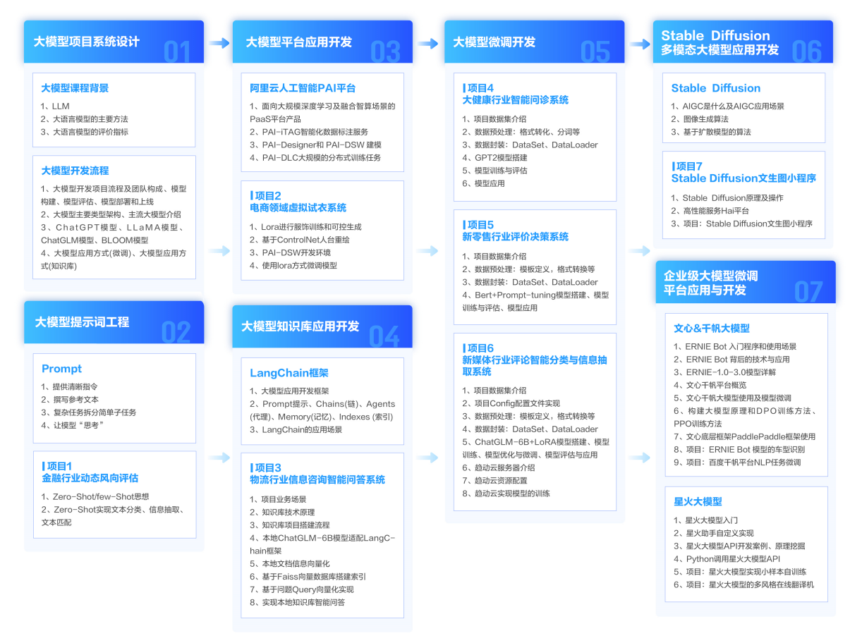 第七阶段: 主要围绕大模型平台的应用与开发进行聚焦,并通过星火大模型、文心大模型等成熟技术平台进行搭建和应用。