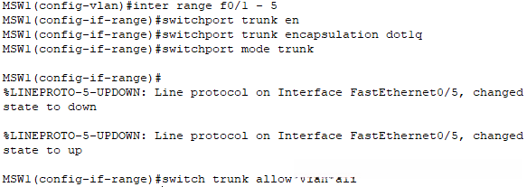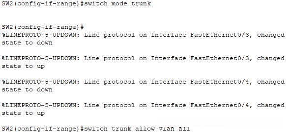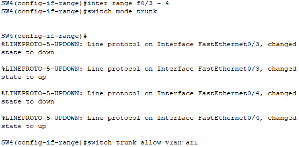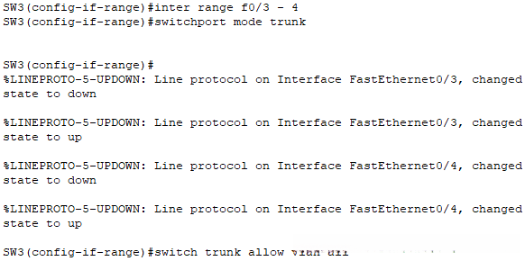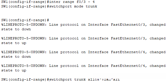 配置f0/3 f0/4为trunk模式 允许所有vlan通过trunk通信