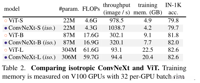 在相同的FLOPs情况下(即计算复杂度相当),基于深度卷积的设计相较于单纯采用密集卷积的传统CNN架构而言运行速度较慢且内存占用更大。自然会质疑这种设计是否会导致整体效率下降。研究表明 ConvNeXts 在推理性能上与Swin Transformer 不相上下甚至略胜一筹 这一优势尤其体现在处理高分辨率图像的任务中(具体比较可参考表1 和表3)。值得注意的是 ConvNeXts 的训练阶段对内存的需求显著低于 Svin Transformers 例如 使用 ConvNeXt-B 主干网络配置下的训练级联掩码RCNN 在单个GPU批量处理2张图时峰值内存占用达到17.4GB 这相比起 Svin-B 的参考值18.5GB 显著减少了约6.9% 的内存需求