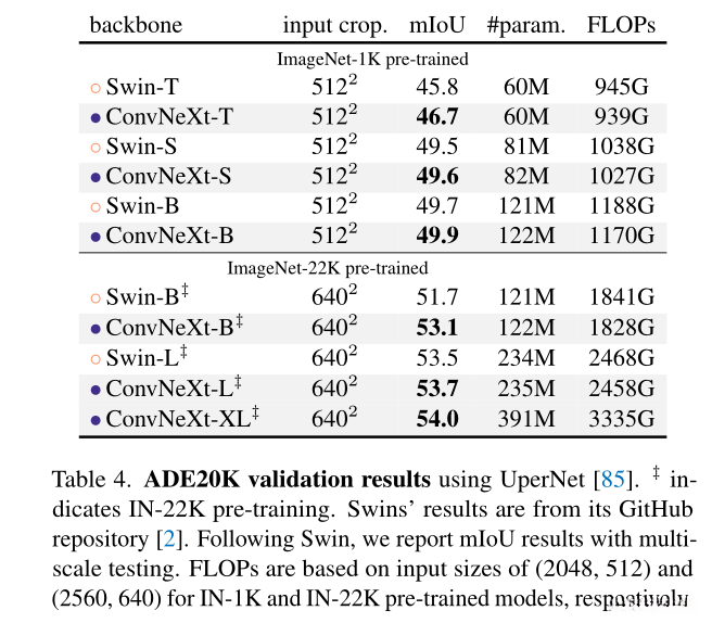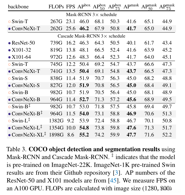 表3展示了目标检测与实例分割的结果,并对Swin Transformer、ConvNeXt以及传统ConvNet(包括ResNeXt)进行了比较。无论模型的复杂度如何变化,在此研究中发现ConvNeXt的性能达到了与Swin Transformer相当甚至更好的水平。