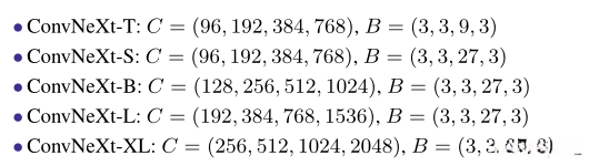 我们开发了多个ConvNeXt变体类型(包括T/S/B/L系列),其计算复杂度与Swin系列网络相近,并参考文献[45]中的内容进行设计。其中前两个系列(T和B)分别对应于ResNet-50和ResNet-200的经典架构设计。特别地,在第三个系列中(XL),采用了更大规模的设计方案。所有这些变体系列均基于相同的模块化设计框架展开发展,并且仅限于在每个阶段中调整通道数量C以及块数量B的不同设置以实现多样化性能特性。