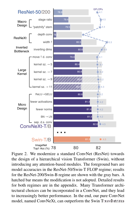 在本节中,我们探讨了从ResNet到与Transformers相近的ConvNet的演变路径.对FLOPs而言,在分析两种模型时发现:其中一个是基于ResNet-50和Swin-T结构的组合.