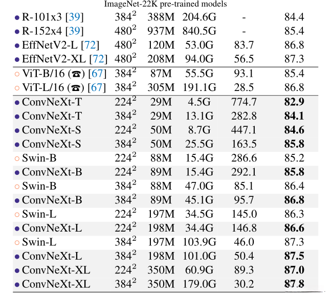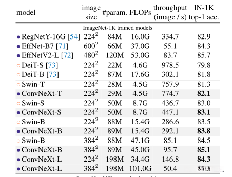 通过测试发现,在分辨率值从224提升至384时(...),ConvNeXt-B相较于Swin-B在浮点运算与吞吐量方面的优势更为显著。同时,在升级至ConvNeXt-L的过程中也验证了这一现象的存在(...)。该模型在这一升级阶段实现了85.5%的性能提升幅度。