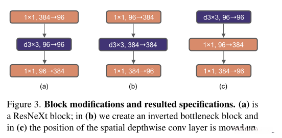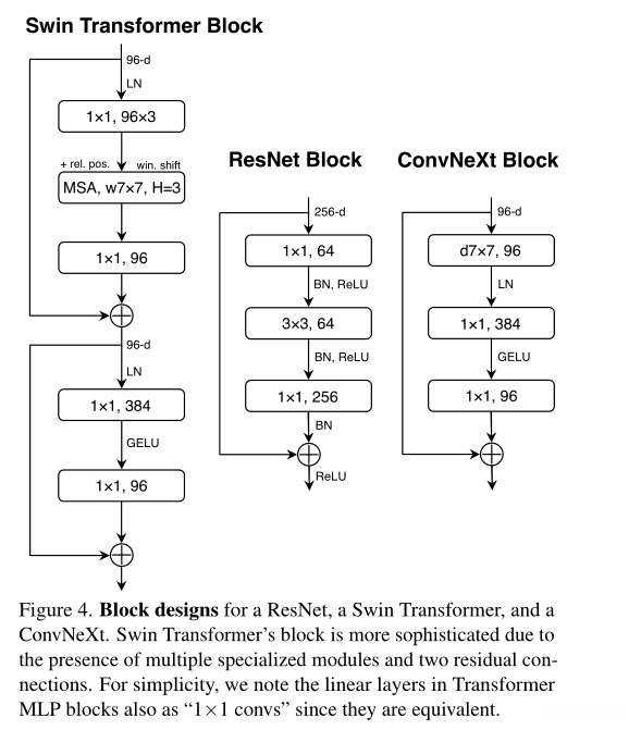 其中一项关键设计是,在Transformer块中引入了反向瓶颈结构。具体而言,在MLP块中,输出通道数是输入的四倍(见图4)。值得注意的是,这种基于Transformer的设计思路不仅限于自注意力机制,在卷积神经网络领域也有应用。该方法在此基础上被MobileNet V2[61]采用并进一步发展,在此基础上又被广泛应用于多种先进的ConvNet架构[70, 71]。