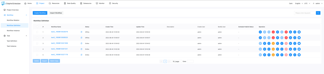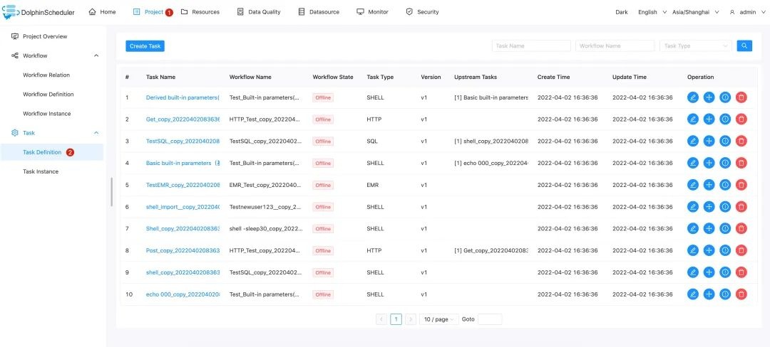 使用 Apache DolphinScheduler 3.0.0 此前版本,用户如果想要操作任务,需要先找到对应的工作流,并在工作流中定位到任务的位置之后才能编辑。然而,当工作流数量变多或单个工作流有较多的任务时,找到对应任务的过程将会变得非常痛苦,这不是 Apache DolphinScheduler 所追求的 easy to use 理念。所以,我们在 3.0.0 中增加了任务定义页面,让用户可以通过任务名称快速定位到任务,并对任务进行操作,轻松实现批量任务变更。