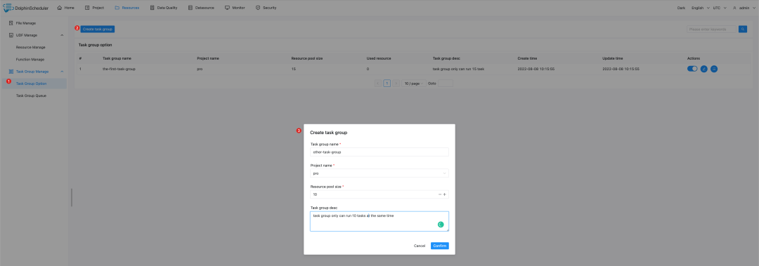 任务组主要用于控制任务实例并发并明确组内优先级。用户在新建任务定义时,可配置当前任务对应的任务组,并配置任务在任务组内运行的优先级。当任务配置了任务组后,任务的执行除了要满足上游任务全部成功外,还需要满足当前任务组正在运行的任务小于资源池的大小。当大于或者等于资源池大小时,任务会进入等待状态等待下一次检查。当任务组中多个任务同时进到待运行队列中时,会先运行优先级高的任务。