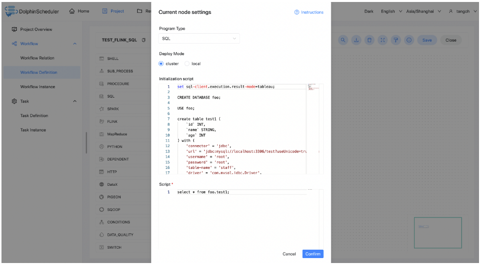 在该版本中,我们扩展了 Flink 任务类型,使其支持运行 Flink SQL 任务,其使用 sql-client.sh 提交任务。在此前的版本中, 我们仅支持通过 flink cli 的方式提交任务, 这种方式需要结合资源中心, 将资源文件提交到资源中心, 然后在任务定义页面引用改资源, 对于版本化和用户透明都不是十分友好. 随着 flink sql 逐渐成为 flink 使用者的主流, 加之直接在编辑页面写 sql 更加用户透明, 我们采纳了向社区贡献的 flink sql 功能. 3.0.0 以后的版本用户可以更加方便的使用 flink 任务了。