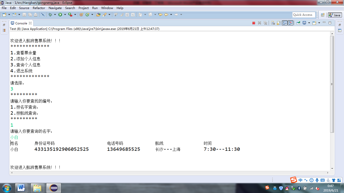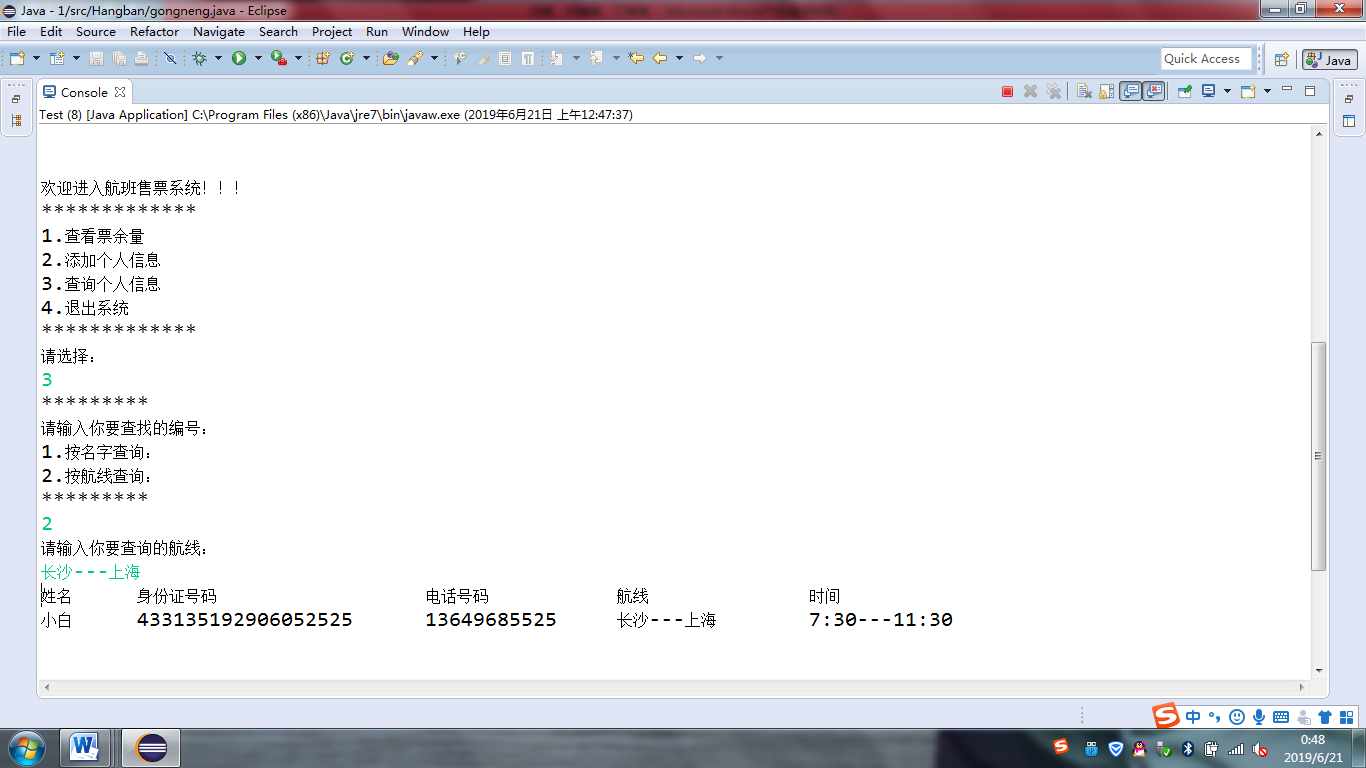 输入:用户的姓名、身份证、电话号码和航班的航线、时间