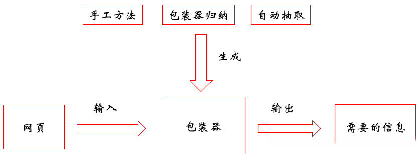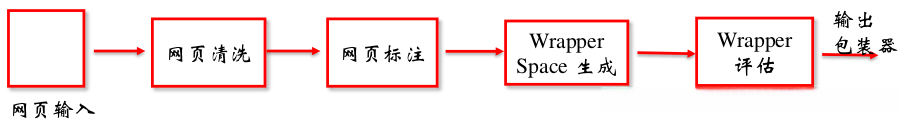 通过包装器归纳这种基于有监督学习的方法 ,自动的从标注好的训练样例集合中学习数据抽取规则,用于从其他相同标记或相同网页模板抽取目标数据。其运行流程为: