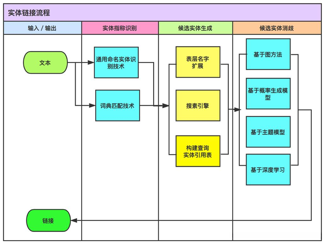 - 输入非结构化的文本数据,经过通用命名实体识别技术 或词典匹配技术 进行实体指称识别