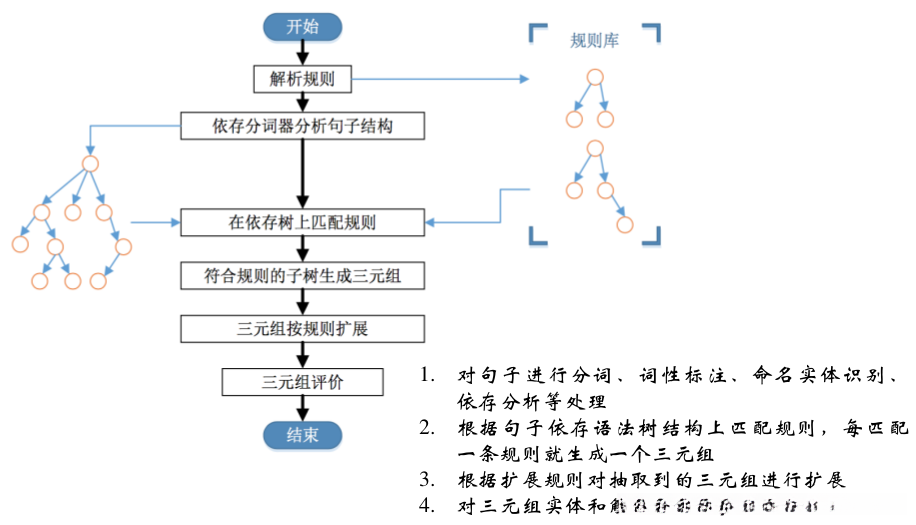 以动词为起点,构建规则,对节点上的词性和边上的依存关系进行限定。一般情况下是形容词+名字或动宾短语等情况,因此相当于以动词为中心结构做的Pattern。其执行流程为: