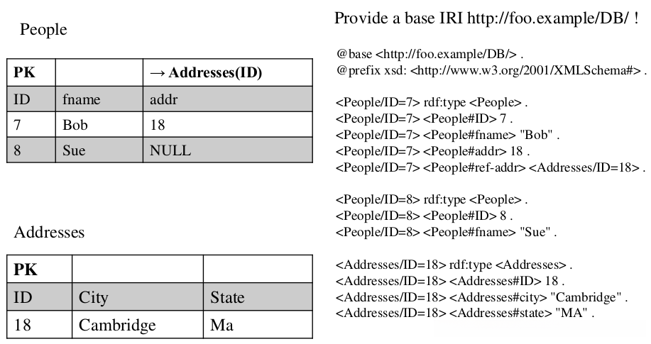 一种常用的W3C推荐的映射语言是R2RML(RDB2RDF)。一种映射结果如下图所示: