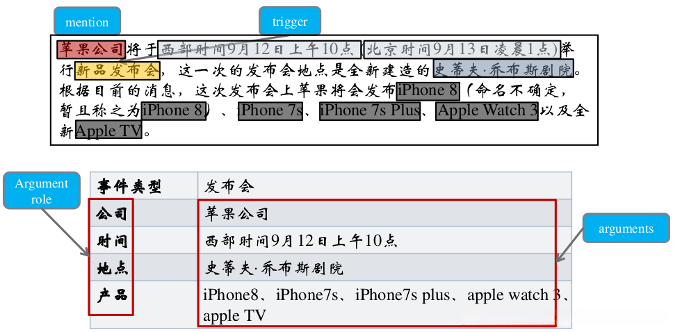 4.事件抽取:例如从一篇新闻报道中抽取出事件发生是触发词、时间、地点等信息