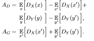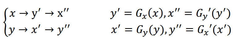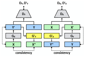 两阶段的GAN保持着两个方向的映射关系,从x->y和y->x 。具体网络信息流向表达如下: