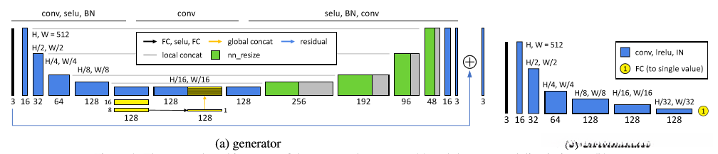 在GAN中生成器一直扮演着重要的角色,因为它将充当最终的美化转化器 ,G的具体结构如下图所示,G网络是基于U-Net进行设计的,U-Net最早在生物医学图像分割领域被提出,但是在之后的许多任务都表现出了较强的性能。然而,U-Net可能不包括全局特征的提取。而全局特征可以揭示高级信息,例如场景类别、主体类别或整体照明条件等,这些信息可用于各个像素以确定其局部调整。对于图像增强而言,这些信息是十分重要的。所以将全局特征添加到了U-Net中,全局特征提取通道与U-Net结构共享前五层的卷积-激活-批归一化层,得到第五层的特征图后,全局特征提取通道进一步将特征图缩小然后通过全连接层。为了将全连接层提取特征图与U-Net低层特征相融合,使用特征拷贝的方式将11128的特征图复制多份并将其与U-Net进行连接。网络除了U-Net具有的特征保留性的U前后跳跃连接,还参考了残差学习的思想,G仅学习输入图片与标签图片的差异。G结构中全局特征提取通道的设计是十分巧妙的,并不需要一个额外的监督网络训练而是使用了U-Net本身来编码隐式特征向量。对于D实质上是一个二分类的网络,由几层卷积构成,具体结构见下图,其主要作用是进行真假图片的判断。