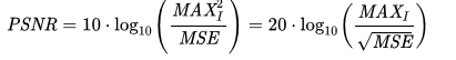 PSNR峰值信噪比:是一种评价图像的客观标准,PSNR的本质和MSE相同,是MSE的对数表示。peak就是指8bits表示的最大值255,MSE是均方误差。PSNR以dB为单位,PSNR值越大表示图像失真越小。具体公式如下(源于维基百科):
