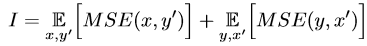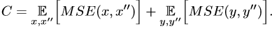基于上述的介绍,可以容易地定义GAN的损失函数,网络的目标包括以下几个损失。第一个是内容映射损失 ,其要求变换图像的内容y'应该与输入图像x相似。由于是双向GAN,还有从y 到x'的映射对应损失。具体公式如下: