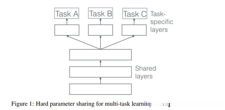 硬参数共享被认为是神经网络实现多任务学习最常用的方法,并始于1993年。如图1所示,在这种方案下硬参数共享通常是通过共用所有任务的隐藏层来实现的 ,同时保留了一些针对特定任务的输出层