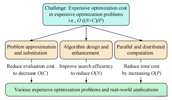 其中O(C)是每一次昂贵评估的平均成本 ;O(N)表示求解该问题的进化计算算法相对于评估次数的时间复杂度(即为找到一个满意解而需要进行的总评估次数 );P是由并行和分布式计算技术提供的优化加速 。