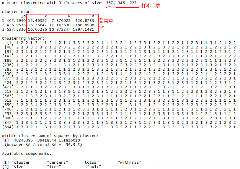 可以看到样本已经被分为三类,每一类的数目分别为367,346,227。