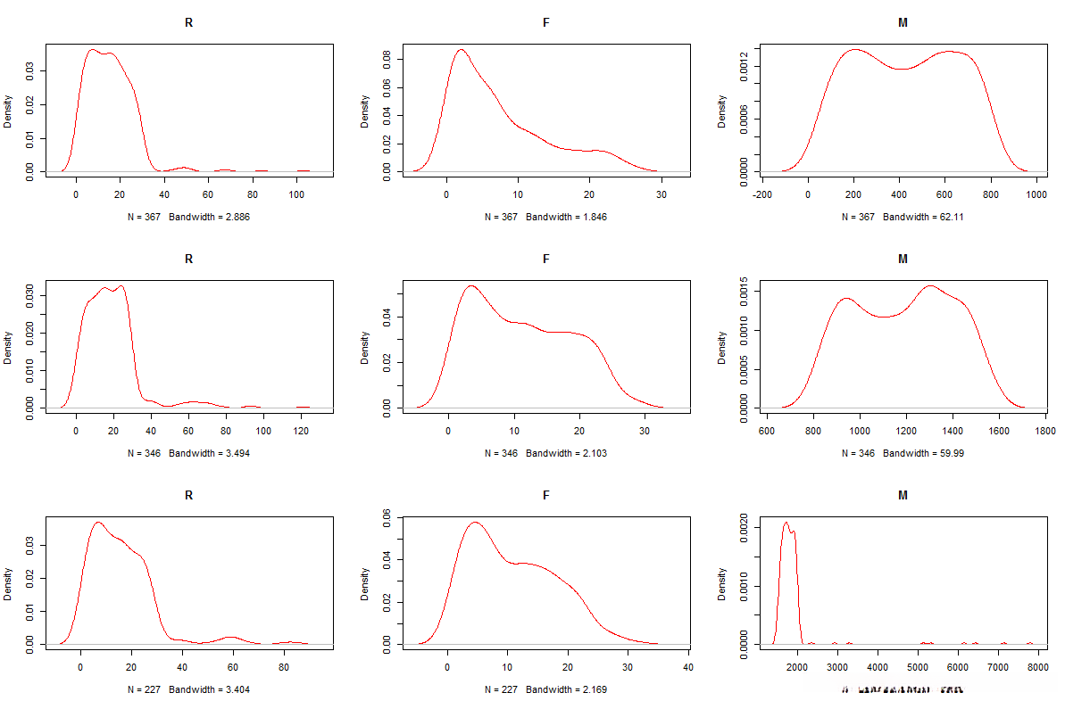 分群2特点:R分布在10-30天,F分布在1-20次,M分布在900-1500元,属于中等水平的客户群体;