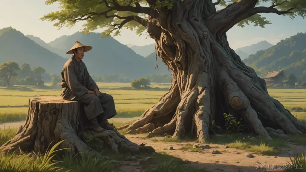 其实,我觉得依然是问法不对。咱要描述场景啊,别讲故事了。稍微修改一下Prompt:一个中国古代的农民,守在田边的树桩旁发愣,远处是长满杂草的农田。