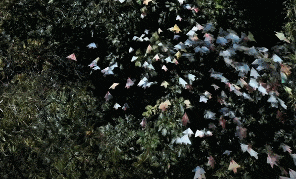 比如,你告诉AI,让它生成一段视频,要求如下:一群纸飞机,在茂密的丛林中翩翩起舞,在树林中穿梭,就像候鸟一样。