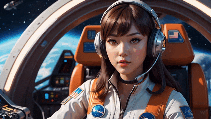 又或者,你喜欢动漫,也喜欢宇宙,那么同样可以根据描述创造出这个场景:一个动漫女孩,亚洲人,操作航天飞机驾驶舱的特写,卡通般的人物,迷人的徽章,闪亮的眼睛。