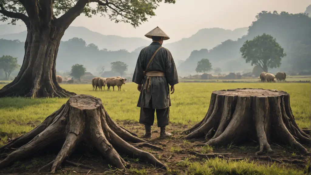 Prompt如下:A farmer from ancient China stood by a tree stump beside the field, lost in thought. In the distance is a field covered with weeds.