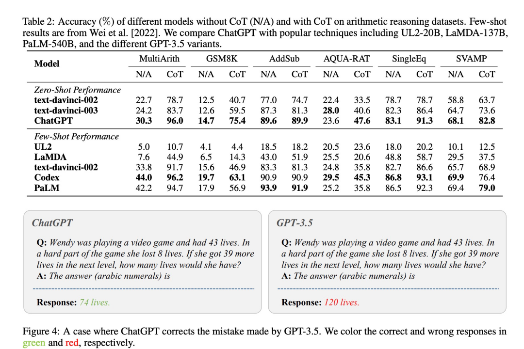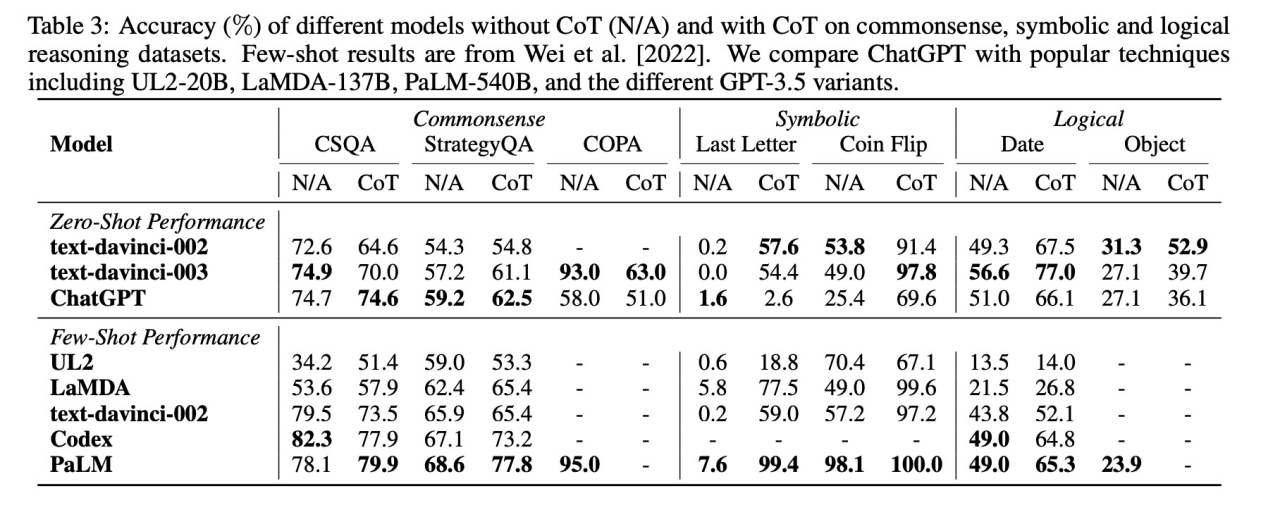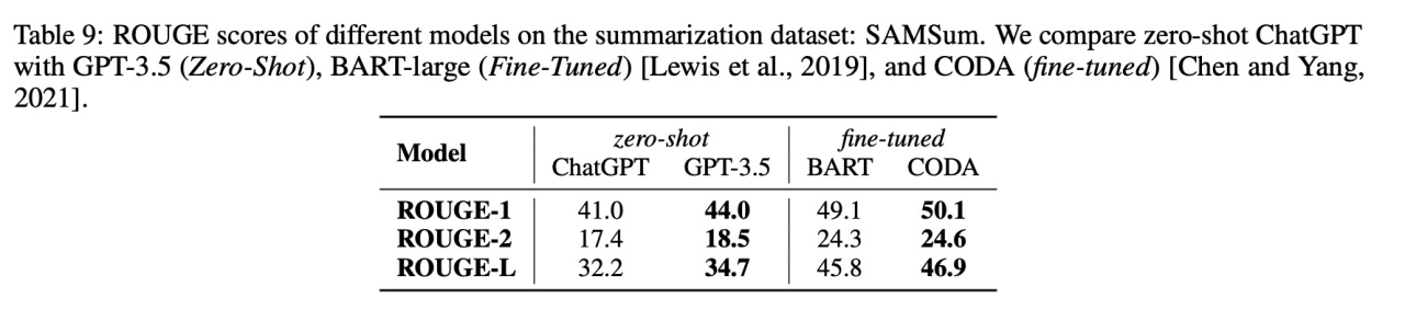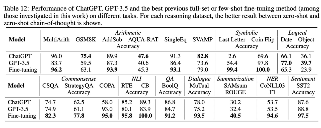 文章提到ChatGPT是在GPT3.5的基础上训练而来,所以在Arithmetic Reasoning、commonsense reasoning、 Symbolic reasoning、Logical reasoning 、Question Answering、Summarization和Sentiment Analysis任务进行对比。ChatGPT的效果在大多数任务优于GPT-3.5,也存在summary和Sentiment 任务表现较差,同时与具体任务微调的模型相比性能较差,与理想的通用模型还有一段距离。
