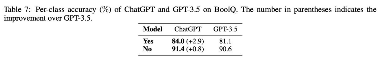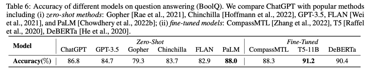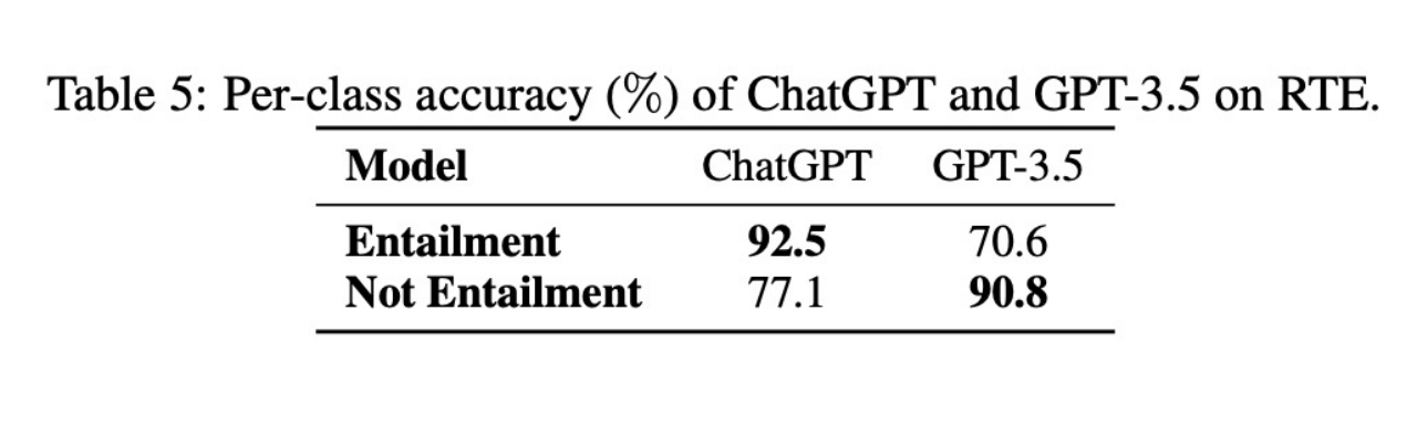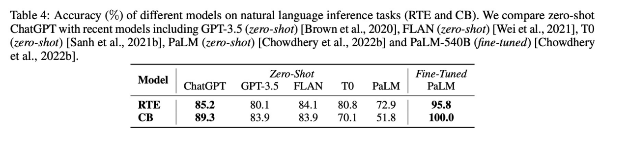 结果:ChatGPT优于GPT3.5,但比该任务微调的模型性能差。另外Not Entailment性能比GPT3.5差