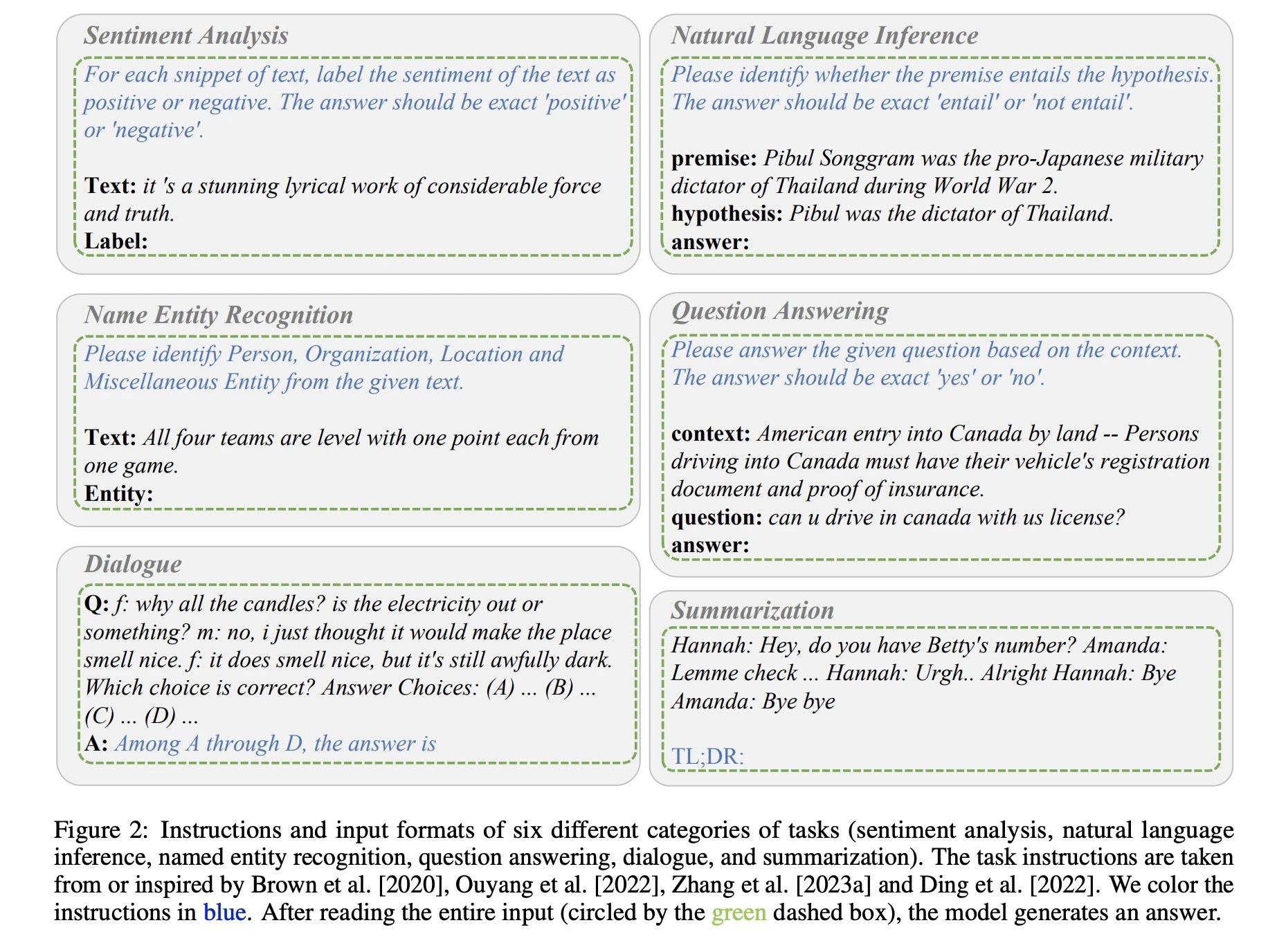 Arithmetic Reasoning、Commonsense, Symbolic, and Logical Reasoning、Question Answering、Natural Language Inference、Dialogue、Named Entity Recognition、Summarization和Sentiment Analysis。