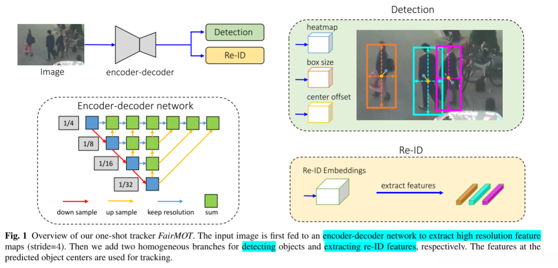 FairMOT 将检测和重识别分支集成在同一个网络中。