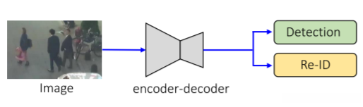 检测模块与重识别模块共享编码-解码网络获取的高质量特征,在处理流程中各自独立运行。