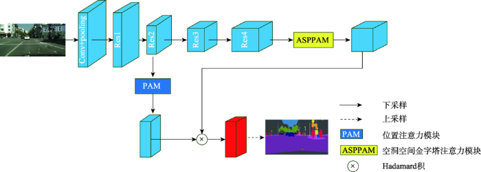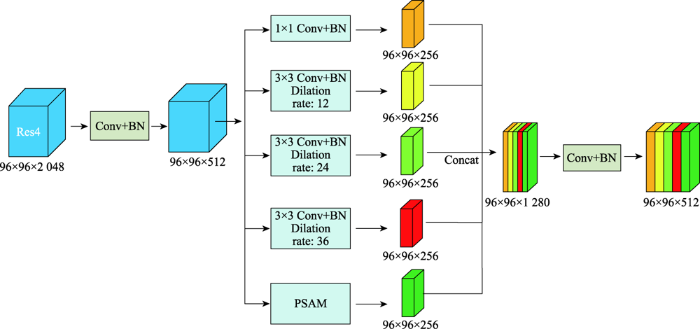 基于OCNet和DeepLab-v3的启发,本研究引入了空洞空间金字塔注意力模块(ASPPAM)和位置注意力模块(PAM)。在多个并行支路中,我们采用了不同空洞率的卷积层,以获取多尺度的上下文信息。此外,我们还设计了一个像素相关性计算模块,旨在增强像素间的相关性。ASPPAM模块能够有效提取高层特征,这些特征涵盖了场景的全局理解,从而保留了物体的综合特征。同时,低级语义信息则富含丰富的空间细节,能够有效保留图像中的关键细节。PAM模块通过融合高级与低级信息,成功解决了高级语义信息丢失的挑战,从而有效处理了图像边缘和细节问题。